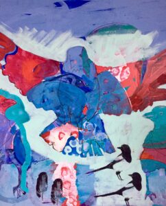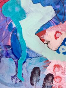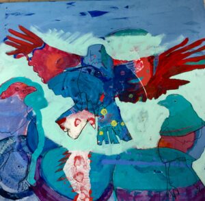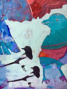 Prøver ut teknikker med ulike fugler med abstraherte farger.